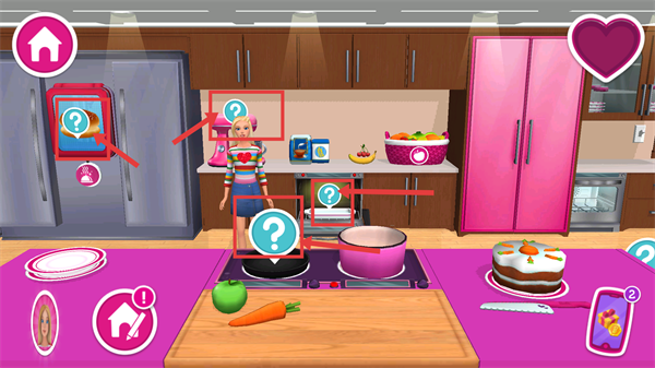 1、觀察界面內(nèi)的【?】標(biāo)記,跟隨紅色箭頭指引,與冰箱、臺面及灶臺處的【?】區(qū)域互動,完成這些操作可推進(jìn)當(dāng)前場景的游戲流程。