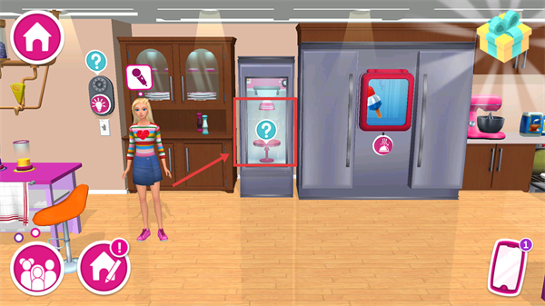 3、跟隨箭頭指引,與界面里的【?】標(biāo)記互動,涵蓋柜子旁及冰箱內(nèi)的【?】,同時關(guān)注左側(cè)【麥克風(fēng)】元素,并完成操作推進(jìn)流程。
