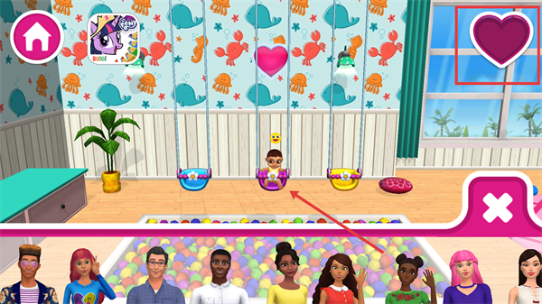 3、進(jìn)入海洋裝飾風(fēng)格的場景后,結(jié)合下方角色選擇欄完成對應(yīng),跟隨紅色箭頭完成秋千處的互動點(diǎn)操作,完成任務(wù)獲得心形能量,推進(jìn)場景進(jìn)度。