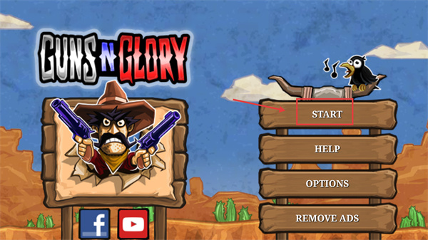 1、在【GUNS-N-GLORY】主界面點(diǎn)擊【START】按鈕,即可進(jìn)入游戲的西部牛仔玩法場(chǎng)景。