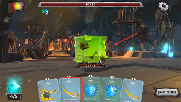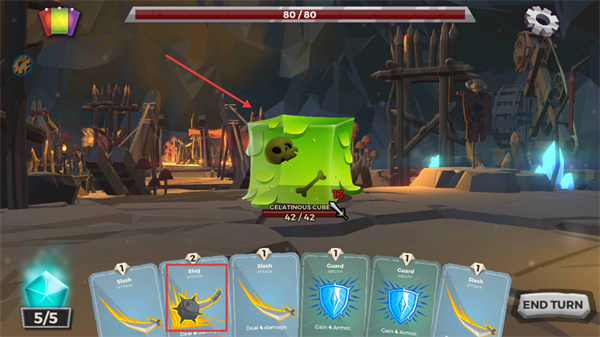 2、對(duì)戰(zhàn)【GELATINOUS-CUBE】時(shí),優(yōu)先使用高費(fèi)卡牌(如【Slug-ATTACK】),快速削減敵方【42/42】生命值。