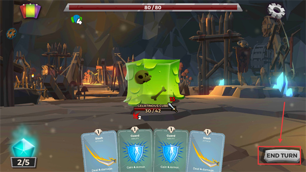 4、當(dāng)手牌輸出完畢后,點(diǎn)擊【END-TURN】結(jié)束回合,等待敵方行動(dòng)后再規(guī)劃下一輪卡牌策略。