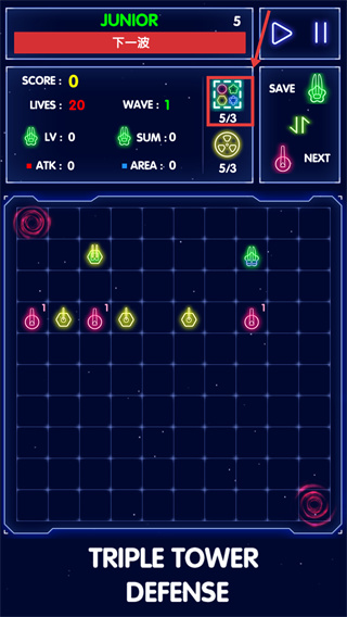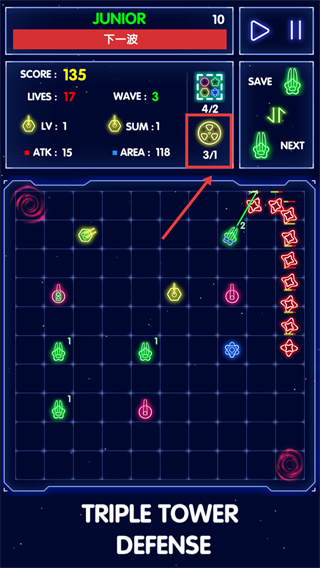 4、合理利用【3/1】標(biāo)識(shí)的特殊資源,觸發(fā)增益效果強(qiáng)化防御塔,同時(shí)點(diǎn)擊【下一波】推進(jìn)關(guān)卡,積累更高分?jǐn)?shù)。