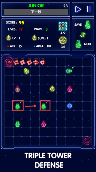 3、將同等級(jí)的防御塔(如【1】級(jí)綠色塔)移動(dòng)合并,提升等級(jí)與屬性,增強(qiáng)對(duì)敵人的輸出能力,推進(jìn)至更高【W(wǎng)AVE】。