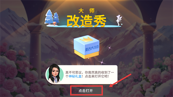 3、進入【大師改造秀】界面,點擊【點擊打開】按鈕解鎖神秘禮盒,獲取對應(yīng)獎勵,推進改造流程的進度。