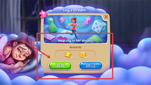 1、在【Lily's Dream】彈窗中,選擇【游戲】按鈕參與夢境闖關(guān)關(guān)卡,可獲取【星星x1-金幣x10】的獎勵;也可點擊【跳過】直接推進流程。