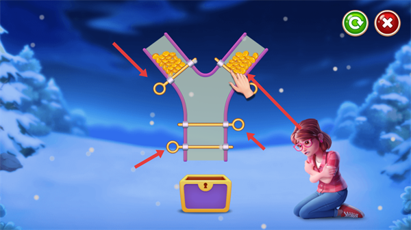 2、在機關(guān)解謎關(guān)卡中,跟著箭頭操作界面的圓環(huán)開關(guān),引導金幣沿管道流動,完成機關(guān)操作以解鎖下方寶箱,獲取對應獎勵。