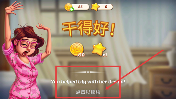 3、完成夢境關(guān)卡后,界面顯示【干得好!】的獎勵提示,點擊【點擊以繼續(xù)】按鈕,領(lǐng)取【金幣x10-星星x1】并進入后續(xù)流程。