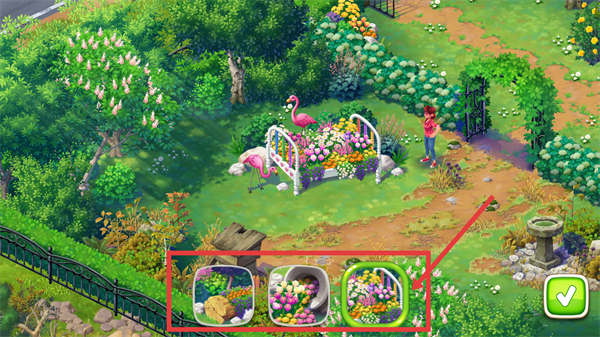 4、在花園裝扮界面,可隨機選擇裝飾方案樣式,確認選擇后完成該區(qū)域的場景布置,推進花園改造的流程進度。