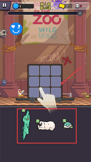 1、進(jìn)入游戲,選擇底部的動物,將其放置到上方格子中,構(gòu)建戰(zhàn)斗陣容。