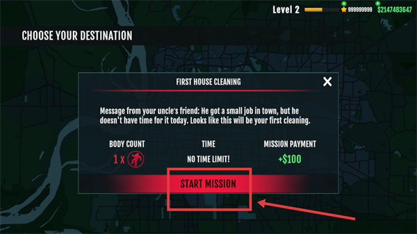 1、接取【FIRST-HOUSE-CLEANING】任務時,確認【BODY-COUNT-1x】和【MISSION-PAYMENT-$100】,點擊【START-MISSION】開啟任務。