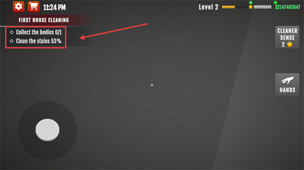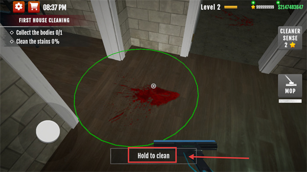 4、對準污漬區(qū)域后,長按【Hold-to-clean】完成清潔操作,逐步消除場景內的污漬以推進任務。