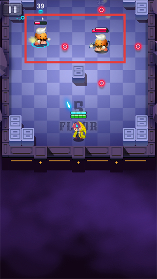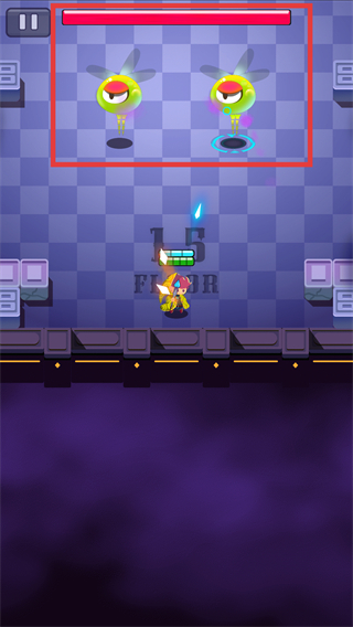 3、遇到【綠色-眼球-帶血條-敵人】時,保持移動躲避攻擊,同時持續(xù)輸出以擊敗敵人推進關(guān)卡。