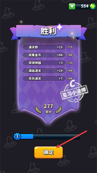 4、通關(guān)后查看【勝利-界面】的獎勵,點擊【確定】按鈕領(lǐng)取【金幣-神器】等資源,為后續(xù)強化做準備。