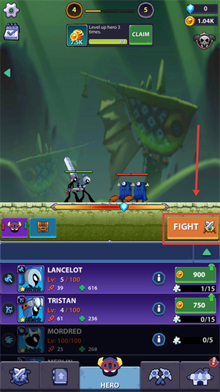 1、戰(zhàn)前先確認(rèn)【HERO】欄中英雄狀態(tài),點擊【FIGHT】按鈕觸發(fā)戰(zhàn)斗。