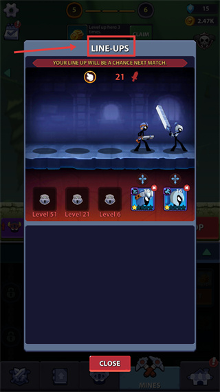 4、進(jìn)入【LINE-UPS】界面后,系統(tǒng)會隨機(jī)匹配陣容,點擊【CLOSE】可返回主界面調(diào)整英雄。