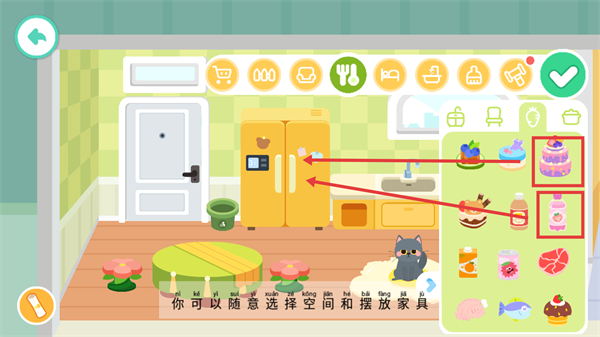 2、進入廚房場景,點擊紅色框選的食物道具,將其放置到冰箱等區(qū)域,完成廚房空間的布置操作。