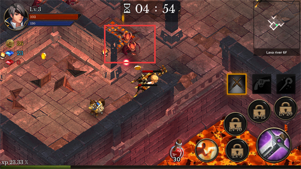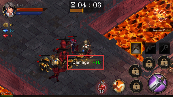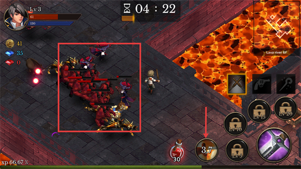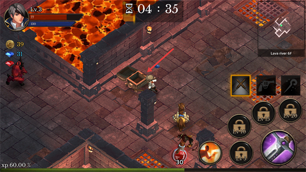 1、在熔巖場(chǎng)景的關(guān)卡中,操控角色攻擊敵方怪物,同時(shí)收集場(chǎng)景中的金幣資源,提升角色的經(jīng)驗(yàn)進(jìn)度。