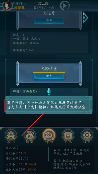 3、收集【晶巖】解鎖【凡階法寶】開發(fā),獲取法寶增強宗門實力,為后續(xù)選拔做準備。