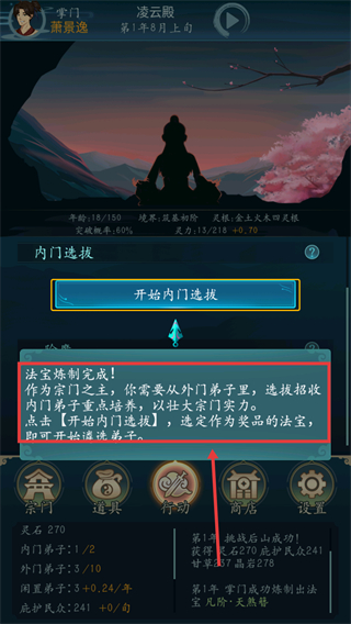 4、完成法寶煉制后,點擊【開始內(nèi)門選拔】用寶物吸引外門弟子,壯大內(nèi)門力量。