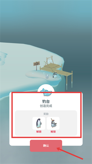 1、點擊彈窗中的【確認】按鈕,領取【企鵝】獎勵,完成釣臺創(chuàng)建流程,解鎖企鵝相關的收益功能。