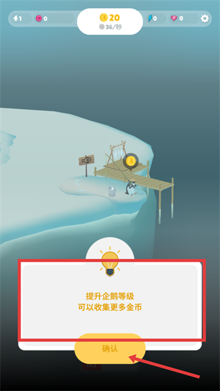 4、點擊【確認】按鈕,明確升級企鵝可增加金幣收集量的機制,后續(xù)可升級提升資源獲取速度。