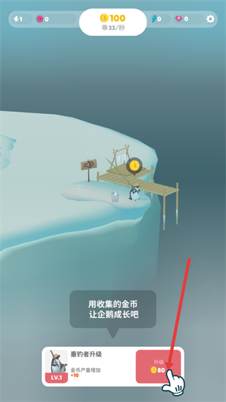 3、消耗【100金幣】點擊【升級】按鈕提升企鵝等級,增強企鵝的金幣產(chǎn)出效率,助力資源積累。