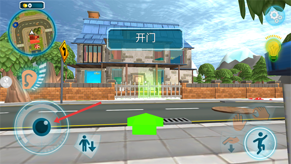 2、進入場景后,跟隨綠色箭頭移動角色,目標是完成【開門】操作。