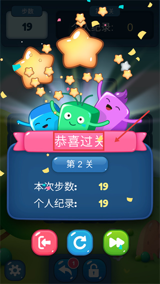 4、通關(guān)后查看【本次步數(shù)-19】與【個(gè)人紀(jì)錄-19】,可選擇重玩優(yōu)化步數(shù),或點(diǎn)擊按鈕進(jìn)入下一關(guān)。