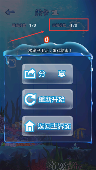 4、當(dāng)氣泡內(nèi)數(shù)字變?yōu)椤?】時(shí),會(huì)顯示分?jǐn)?shù),此時(shí)可選擇【重新開(kāi)始】再次挑戰(zhàn)。