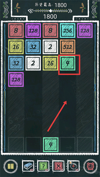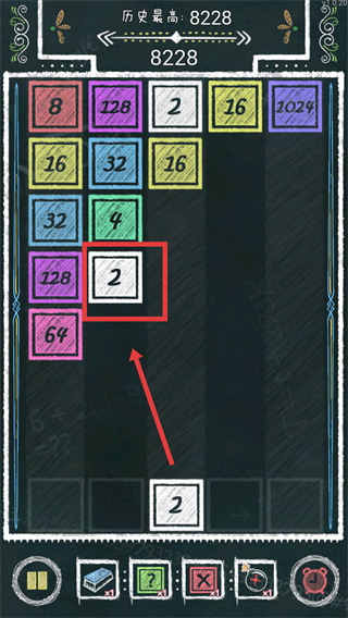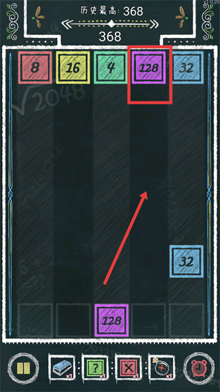 2、觀察上方出現(xiàn)的【128】數(shù)字方塊,將其放置到下方相同數(shù)字的位置,觸發(fā)合并得到更高數(shù)字并增加分?jǐn)?shù)。