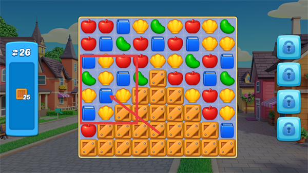2、注意【【蘋果】的位置,合理移動消除以積累目標(biāo)物品,剩余步數(shù)內(nèi)完成收集可獲獎勵。