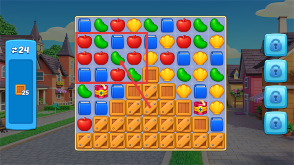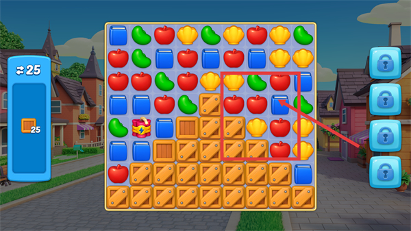 3、移動豆子使蘋果完成合并消除,獲得道具后消除箱子提升收集效率,快速達(dá)成關(guān)卡目標(biāo)。