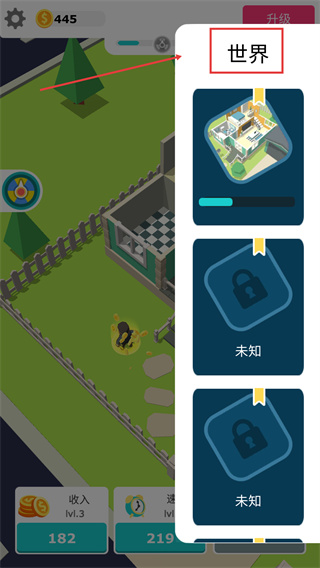 4、解鎖【世界】界面后,推進(jìn)當(dāng)前區(qū)域的進(jìn)度條,完成后可解鎖新的【未知】區(qū)域,拓展經(jīng)營范圍提升整體收益。