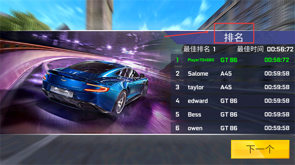 3、結(jié)算界面的【排名】面板會(huì)顯示賽事成績,當(dāng)前最佳排名為1,可點(diǎn)擊【下一個(gè)】進(jìn)入后續(xù)賽事。