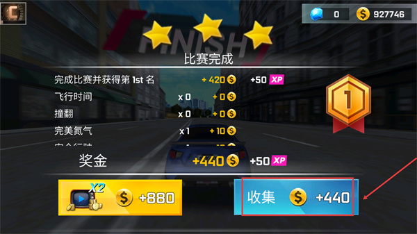4、比賽完成后可選擇【收集】獲取【+440$】獎(jiǎng)勵(lì),也可觀看廣告獲得雙倍獎(jiǎng)勵(lì),同時(shí)還能獲得50XP的經(jīng)驗(yàn)。