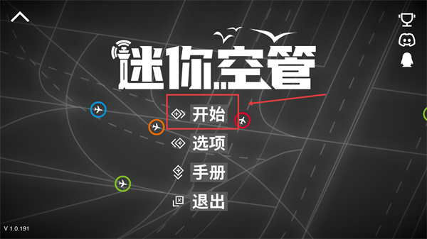 1、在【迷你空管】界面點擊【開始】按鈕進入游戲,同時可通過【選項】【手冊】了解玩法規(guī)則,做好前期準備。