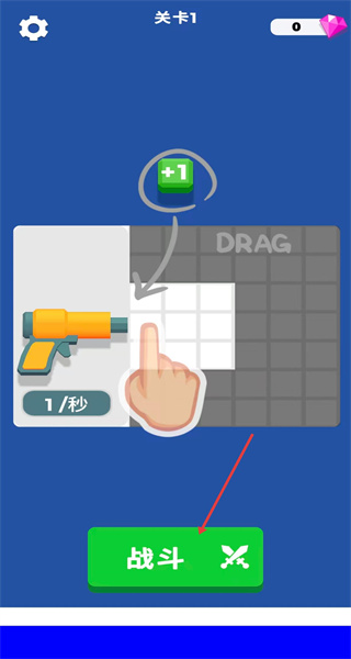 1、打開游戲后,界面顯示關(guān)卡1和操作提示,將綠色道具拖至對應(yīng)格子,配備每秒1發(fā)的武器,點(diǎn)擊綠色戰(zhàn)斗按鈕。