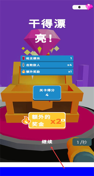 4、成功通關(guān)后顯示干得漂亮,獲得槍支模塊擊敗敵人額外獎勵共得6分,點(diǎn)擊繼續(xù)進(jìn)入下一關(guān)。