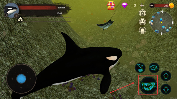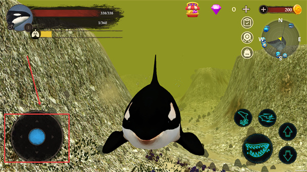 2、通過左側(cè)方向控制鍵操控虎鯨移動,同時留意上方【338/338】的狀態(tài)數(shù)值。