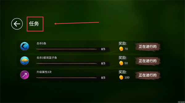 4、打開【任務(wù)】界面查看目標,優(yōu)先完成【擊殺5魚】等基礎(chǔ)任務(wù),獲取金幣獎勵助力后續(xù)發(fā)展。