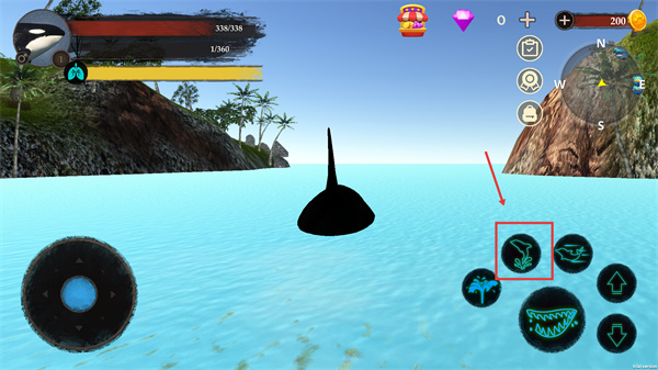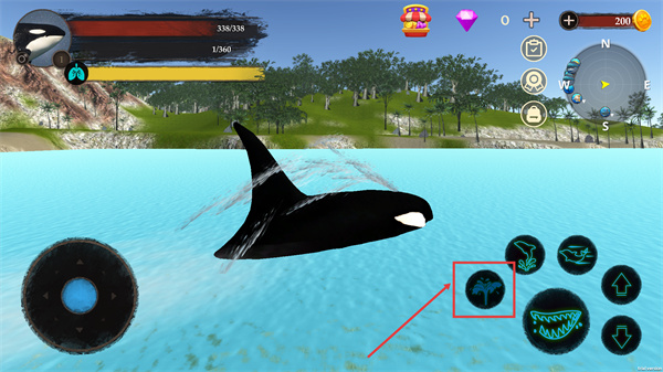2、使用帶有棕櫚標(biāo)識(shí)的技能按鈕,可讓虎鯨執(zhí)行躍出水面的動(dòng)作,增加游戲趣味性。