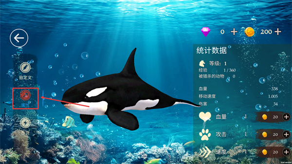 3、進(jìn)入【自定義】界面可查看【統(tǒng)計(jì)數(shù)據(jù)】,通過(guò)消耗資源升級(jí)【血量】【攻擊】等屬性,強(qiáng)化虎鯨的生存與戰(zhàn)斗能力。