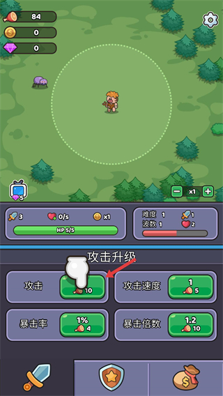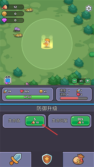 3、除了攻擊升級(jí)外,還能進(jìn)行防御升級(jí),點(diǎn)擊生命值對(duì)應(yīng)的升級(jí)按鈕,提升角色的生存能力,更好地應(yīng)對(duì)怪物的攻擊。