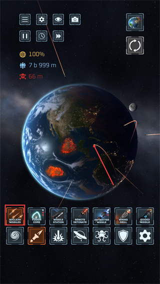 2、選擇【NUCLEAR-MISSILES】武器對星球發(fā)起攻擊,觀察其造成的局部破壞效果。