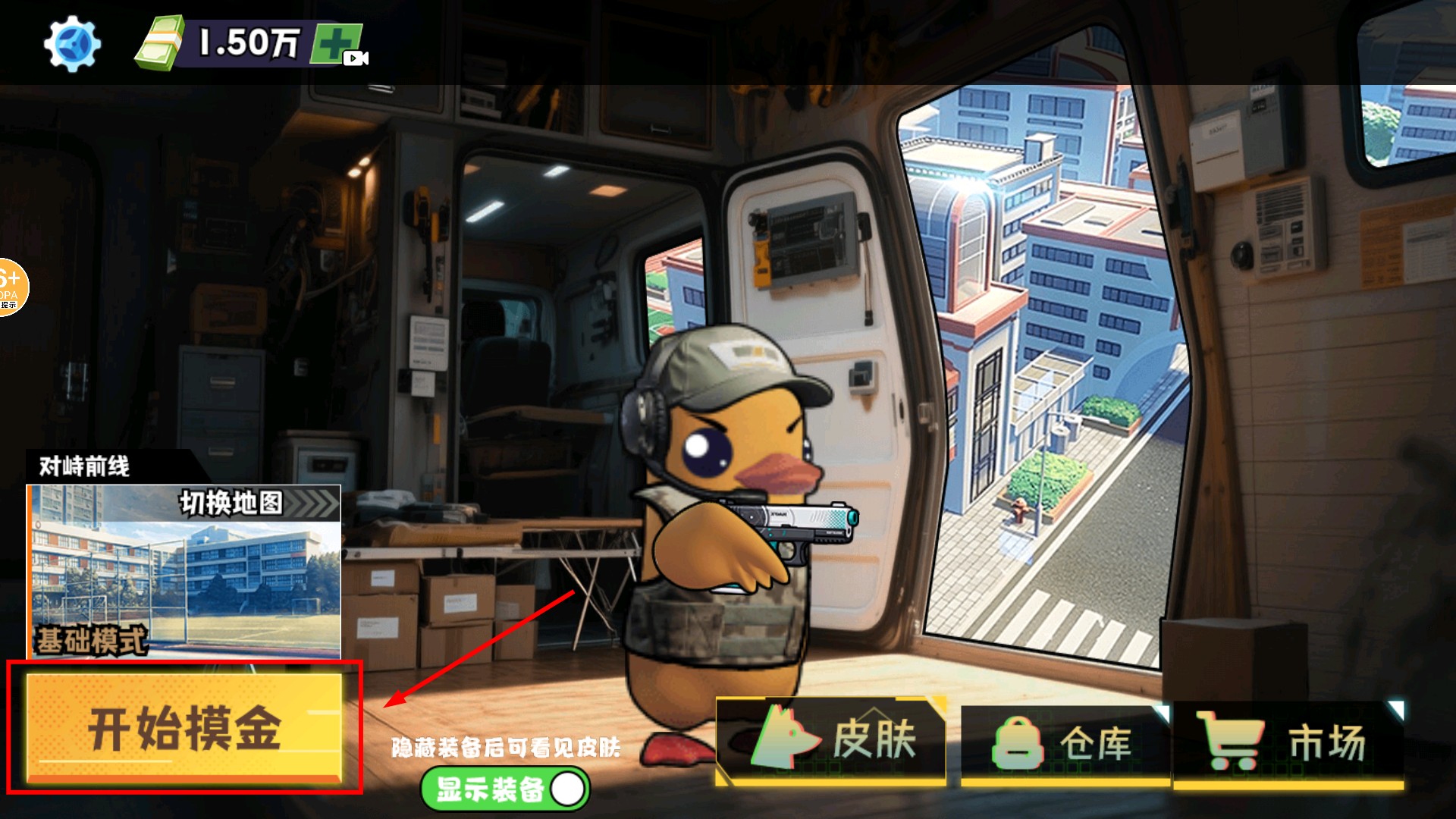 1、進(jìn)入游戲主界面后,可先點(diǎn)擊【皮膚】-【倉(cāng)庫(kù)】調(diào)整修狗外觀,再點(diǎn)擊【開(kāi)始摸金】按鈕進(jìn)入戰(zhàn)斗準(zhǔn)備階段。