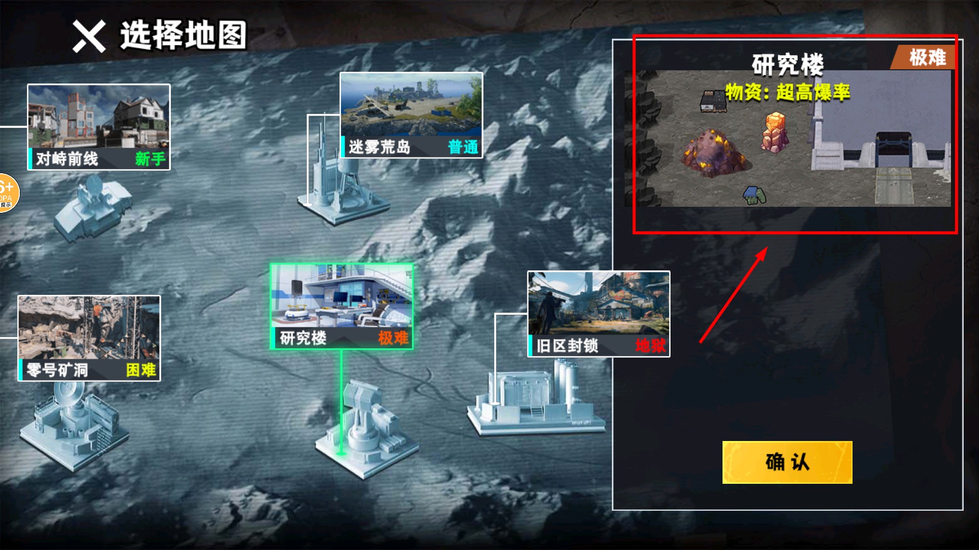 4、選擇地圖時(shí),【研究樓】極難模式雖挑戰(zhàn)大,但物資超高爆率,適合有一定裝備基礎(chǔ)的玩家嘗試。