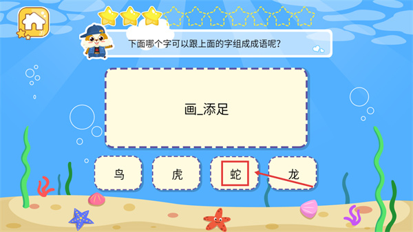 4、面對成語【畫_添足】填空題,選擇【蛇】選項,可組成成語“畫蛇添足”。