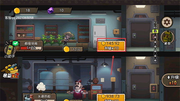 4、在基地界面點(diǎn)擊【升級(jí)x10】按鈕,消耗145.92金幣升級(jí)設(shè)施,提升【糧食培育】等功能的效率。