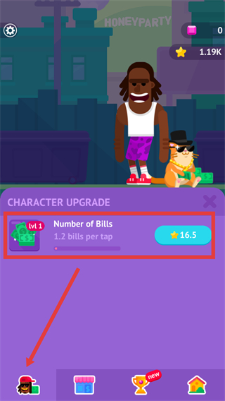 2、點(diǎn)擊底部角色圖標(biāo),打開升級界面選擇對應(yīng)選項提升收益。